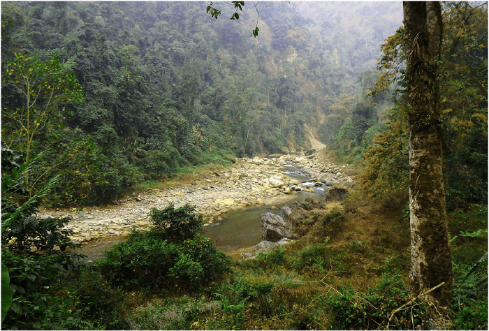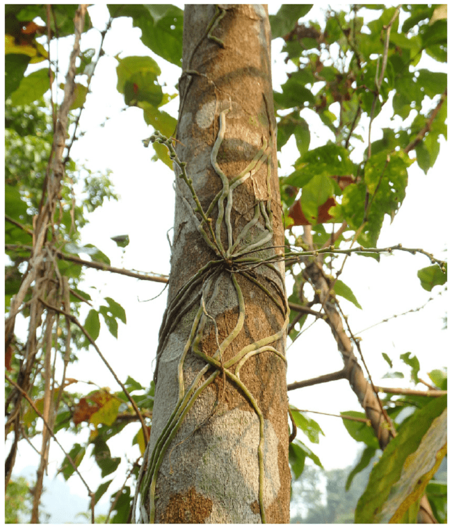 Distribution: Chiloschista gelephuense is currently Tshachu hot springs north of the city of Gelephu in southern Bhutan. No additional flowering specimens of Chiloschista gelephuense has been observed, only plants in bud growing epiphytically on Beaumontia grandiflora Wall., (Apocynaceae) and Aphanamixis polystachya (Wall.) Parker (Meliaceae) close to the type locality (Figure 7-8).