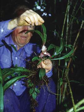 I had the great fortune to spend some time with Carl in the field as well, both locally in the Everglades and in South America looking for new Dracula and Masdevallia species. My first field adventure together with Carl took place in Ecuador in 1982. It was a great but also rather scary experience because we joined forces with Father Angel Andreetta, the Salesian Missionary Priest who later developed the world-renown orchid nursery Ecuagenera together with the Portilla family. Though the company was impressive and perhaps a bit intimidating, both Carl’s and Andreetta’s driving skills were definitely hair- rising. But at least Carl did not try to hit the stray dogs, which were in deep jeopardy when Andreetta was at the steering wheel. We survived though and eventually managed to find a few new Masdevallia species so the trip was quite successful in the end. The trip to Ecuador in 1984 was tough for different reasons. Carl got up before daylight every day and insisted that we should spend as much time in the field as possible, come rain (most of the time) or sunshine. In the late afternoons his “crew”, consisting of Job Kuijt, a Canadian mistletoe expert, my Swedish travel companion Thomas Höijer and me were slumped in the car, exhausted, hungry and soaking wet. Carl on the other hand was standing outside pressing Stelis and other insignificant little orchids. He really enjoyed this, both because the “weaklings” were more tired than he was, but also because he usually had a number of unknown plants to work with. The rain did not bother him at all it seemed. all the collection information then went into a flimsy little notebook, which had the irreplaceable data from a number of previous field trips. One day disaster struck as he was fiddling with the ever growing herbarium press. He suddenly began looking stressed, frantically patted his pockets and started to look around. Obviously something was wrong so we had to ask what was happening. His note book was gone! With years of unique data! We all scrambled out of the car and into the twilight of the early evening. Then followed a thorough search where we had to take everything out of the car in a desperate search for this infinitesimal little note book. The panic was not far away from Carl’s eyes when we finally located it under one of the seats. When I asked him why he brought the same little notebook to every trip instead of getting a separate one for each, he said that it would be a shame not to use every page.