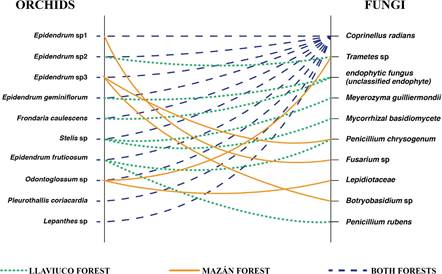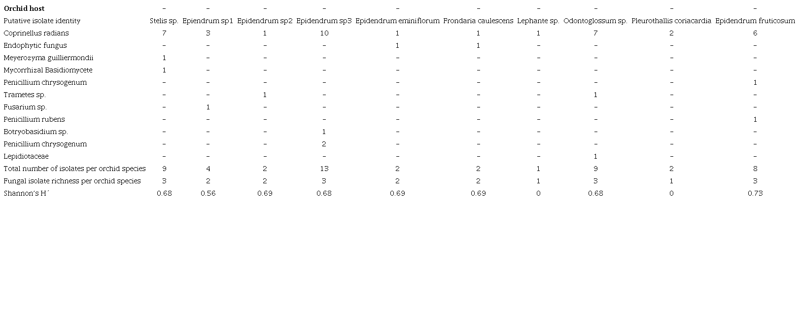When analyzing how the diversity of endophytes was distributed across the diversity of orchids, no more than three different endophytic fungi were associated to the same orchid species (Fig. 1). In the case of Pleurothallis coriacardia and Lepanthes sp., only one endophyte was associated with their roots. Most fungal endophyte isolates (six out of 10) were recovered from the roots of only one orchid species, although three endophytes were isolated from two different orchid species. Most notably, Coprinellus radians was isolated from all orchid species sampled (Fig. 1 and Table 3).