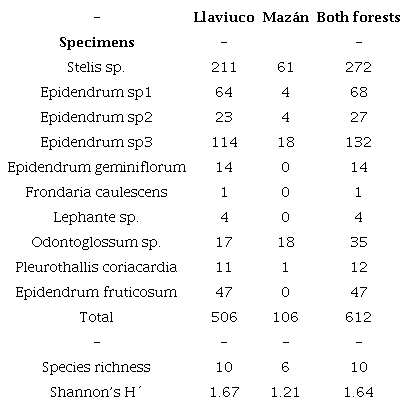 A total of 612 orchids were identified within the experimental plots. These orchids were classified within six genera and 10 species, namely: Epidendrum fruticosum Pav. ex Lindl., E. geminiflorum Kunth, Epidendrum sp.1, Epidendrum sp.2, Epidendrum sp.3, Lepanthes sp., Frondaria caulescens (Lindl.) Luer, Pleurothallis coriacardia Rchb.f., Odontoglossum sp. and Stelis sp. The most abundant species was Stelis sp. with 272 specimens. Epidendrum was the most represented genus with five species identified. Each forest showed different orchid diversity indices, whereby Llaviuco generally showed higher diversity than Mazán (Table 1). Specimens of E. fruticosum, E. geminiflorum, F. caulescens, and Lepanthes sp. were present only in plots located in the Llaviuco forest.