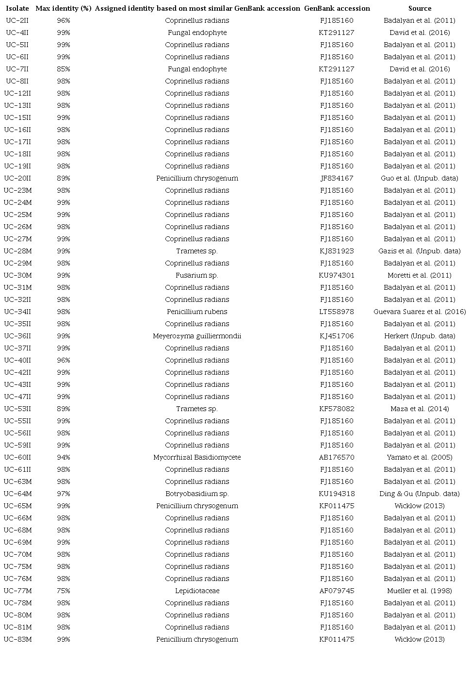 Fifty-two pure isolates were recovered from the orchid roots. These isolates were classified as Coprinellus radians, Trametes sp., Meyerozyma guilliermondii, Penicillium chrysogenum, Penicillium rubens, Fusarium sp., Botryobasidium sp. and Lepidiotaceae (Table 2). An additional isolate was classified at the division level as a mycorrhizal Basidiomycete, and one isolate remained taxonomically unclassified, although its sequence has been reported to belong to an endophytic fungus colonizing purple loosestrife (Lythrum salicaria) (David et al. 2016). Forty-one of the 52 isolates were classified as C. radians, making this species the most abundant in orchid roots from both forests; all other species were represented by only one or two isolates each. Coprinellus radians, Trametes sp., and P. chrysogenum were isolated from both forests, whereas the other fungi were found exclusively in either the Mazán or Llaviuco forest.