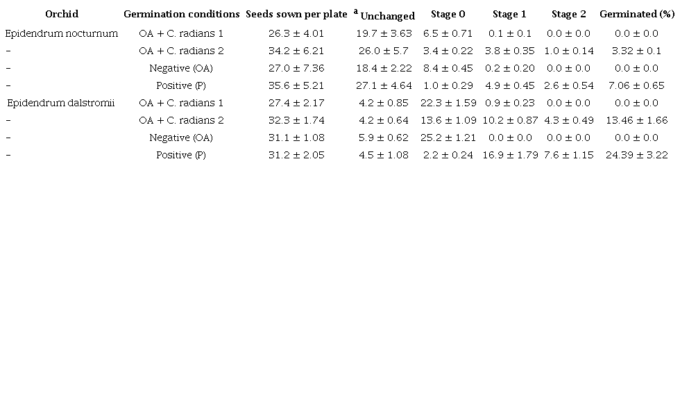 Due to the presence of the fungal species C. radians in all sampled orchid species, a germination test was carried out with two different isolates belonging to this fungus (C. radians 1 and C. radians 2). Only isolate C. radians 2 promoted germination of both Epidendrum dalstromii and E. nocturnum seeds (Table 4). The germination rate in co-culture with C. radians 2 was low in absolute terms (2.9% and 13.3% for E. nocturnum and E. dalstromii, respectively); however, no seeds germinated in the plates containing oatmeal agar without fungi, indicating germination promoting effect of this fungus. Nonetheless, this germination promoting effect was not as strong as the one observed in nutrient-rich Phytamax™ (7.3% and ~24.4% for E. nocturnum and E. dalstromii, respectively).