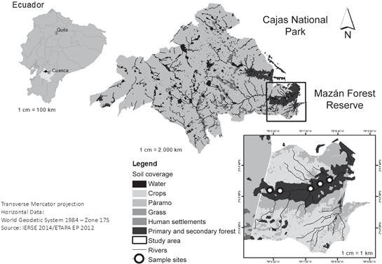 Study site.- Samples were collected in the Mazán Forest Reserve, located about 10 km east of the city of Cuenca (Azuay Province, Ecuador), at 02°50’S and 79°13’W (Fig. 1). This forest reserve occupies a total area of 2640 ha, ranging from 2800 to 3500 m in elevation. The annual precipitation in this region varies between 1000 and 2000 mm, with a temperature range between 6 and 12°C. Mazán Reserve is representative of the evergreen high montane forests and contains about 300 species of vascular plants, among which are 40 species of epiphytes, including orchids and bromeliads (Guzmán & Moreno 2014). The areas adjacent to the Mazán river are covered by both primary and mature secondary forests, with an important arboreal stratum represented by species such as “Arrayan” (Myrcianthes rhopaloides), “Romerillo” (Prumnopyts montana), “Sarar” (Weimannia fagaroides), “Pururug” (Hedyosmum luteunyii), “Tililin” (Piper andreaum), and “Jigua” (Ocotea sp.), among others. These trees foster the maintenance of a constant humidity and contribute to the absence of a marked dry season, creating a suitable place for the establishment of an important diversity of epiphytic species (Beltrán 2001).