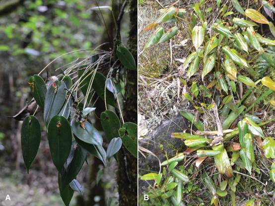 Orchid species description.- Pleurothallis coriacardia Rchb.f. is an abundant species in Mazán Reserve, showing abundant wild populations in primary and secondary forests. Its growth habits are both epiphytic and lithophytic (Fig. 2). The most important morphological characteristics of this species, as recorded in the field include: i) sympodial growth, with unifoliar stalks covered in the base by purple bracts; ii)