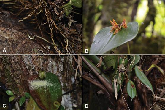 oblanceolate and leathery leaves, sub-petiolated at the base; iii) velamentous roots exhibiting a characteristic green-translucent color at the tip (Fig. 3A); iv) apical inflorescences with up to 5 flowers-exhibiting fused lateral sepals and yellow-colored edges-per stem; v) small and elongated petals, varying from brown/ reddish to yellow; vi) yellow to green lips and columns, with yellow colored pollinia (Fig. 3B); and, vii) apical capsules developing from each flower and containing thousands of pale-yellowish seeds of about 60-40 µm in length (Fig. 3C). The presence of asexual propagules emerging from the petiole, showing an abundant development of roots and new stems with no bulbs, was frequently observed (Fig. 3D). We also noticed the presence of numerous P. coriacardia protocorms, indicative of natural germination of the orchid seeds. Plant material.- From February to March 2016 root samples were collected from 35 different adult individuals of P. coriacardia colonizing either rock substrates, live phorophytes, or decomposing arboreal substrates. Living phorophytes were mainly M. rhopaloides, W. fagaroides and Ocotea sp., but also other less representative phorophytes were present. We selected five different sites, separated from each other by no less than 200 m, for collecting samples in the forest (Fig. 1). We took care to include orchids from at least one rock and three of the most representative phorophytes from each site. The samples consisted of several root fragments of approximately 3 cm in length, which included the green-translucent tips. Each sample was placed inside a sterile plastic bag and transported to the laboratory in Cuenca. Samples were refrigerated at 4°C for less than 24 hours after collection until fungal isolations were performed.