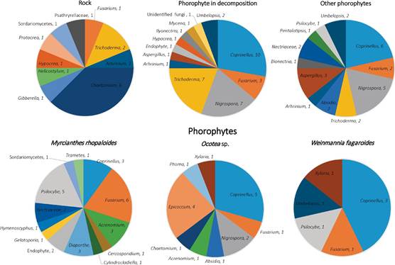 Coprinellus (Psathyrellaceae) was the most frequently occurring genus in the entire collection (20% of the isolates), followed by Fusarium (Nectriaceae), Nigrospora (Trichosphaeriales), and Trichoderma (Hypocreaceae) (represented by 10%, 10%, and 8% of the isolates, respectively). The isolates originated from P. coriacardia individuals colonizing various substrates. We found 16 isolates originated from lithophytic plants; 82 from epiphytic individuals colonizing the most representative phorophytes (7 from W. fagaroides; 17 from Ocotea sp.; 30 from M. rhopaloides; 28 on other less abundant phorophytes); and the remaining 36 originated from P. coriacardia collected from decomposing substrates (Fig. 4). Information of the entire endophytic collection are detailed in (Appendix 1).