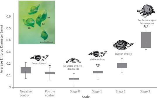 To score the seed development, we followed the same scale used in the preliminary assay, counting all seeds in each plate. To establish a relationship between seed diameter and developmental stage we only considered an average of 30 seeds, and conducted a Kruskal-Wallis non-parametric test and a sequential Bonferroni-corrected test (p=0.003) (Holm 1979). The same analysis was used to test whether there was a difference in the development rates of each stage with the different isolates and with the negative and positive control. Embryo development and seed diameter data were analyzed with XLSTAT (V. 2014.5.03) (Addinsoft 2014).