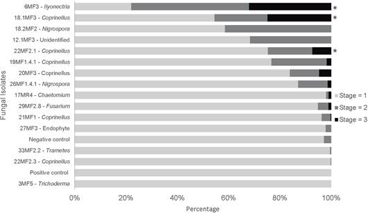 Isolates selected from this assay were identified as Ilyonectria (6MF3), Coprinellus (18.1MF3, 22MF2.1, 19MF1.4.1, 20MF3, 21MF1, and 22MF2.3),