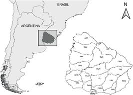 Uruguay esta ubicado en el Cono Sur sudamericano, limitando al Oeste con Argentina, y al Norte con Brasil. Su superficie continental es de 176.215 km2, con costas al Sur sobre el Río de la Plata (452 km de longitud) y al Este sobre el Océano Atlántico (228 km) (Instituto Geográfico Militar [IGM] 2020). La red hidrográfica es extensa, con seis cuencas hidrográficas principales: Río Negro, Río de la Plata, Río Santa Lucía, Río Uruguay (asociadas al Río de la Plata) y Laguna Merín, y Océano Atlántico (asociadas al Océano Atlántico). Se destaca el Río Santa Lucía por ser la principal abastecedora de agua potable para la capital y zona metropolitana (aproximadamente el 50 % de la población total) (MVOTMA-Geoservicios 2020b). Se encuentra en una zona climática templada, con precipitación media anual de 1300 mm y temperatura media de 17.5ºC (IGM 2020, Instituto Uruguayo de Meteorología [INUMET] 2019). Presenta una división administrativa organizada en 19 departamentos: Artigas (ART), Canelones (CAN), Cerro Largo (CER), Colonia (COL), Durazno (DUR), Flores (FLE), Florida (FLI), Lavalleja (LAV), Maldonado (MAL), Montevideo (MON), Paysandú (PAY), Río Negro (RIO), Rivera (RIV), Rocha (ROC), Salto (SAL), San José (SAN), Soriano (SOR), Tacuarembó (TAC) y Treinta y Tres (TRE) (Fig. 1).