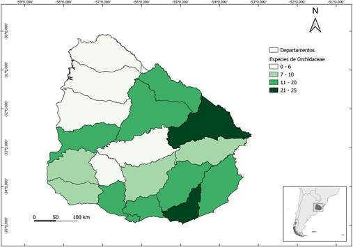 Por último, cerca del 20% de las especies del país presentan una única o pocas colectas (entre una y tres) y 30% tienen registros de colectas a inicios del siglo pasado y en áreas que se han convertido en zonas urbanizadas. Varias de estas (Brachystele waldemarii. Habenaria platanthera y Pelexia arechavaletae), son endémicas del país y solo se conocen por el espécimen typus ya que no han sido colectadas nuevamente, por lo que existe la posibilidad que puedan haberse extinguido con el paso del tiempo y por eso no existe hasta la fecha registros científicos ni muestras adicionales en los herbarios. Esto puede influir en la disminución de la riqueza de especie de 59 a 43 especies para el país, por lo que es preciso priorizar el enfoque y esfuerzo de colecta hacia estas especies que podrían estar extintas en el país.