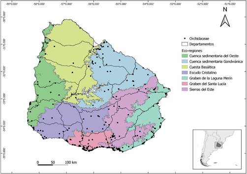 La distribución en Uruguay es presentada por departamentos, ambientes y eco-regiones de ocurrencia. Los mapas fueron elaborados en el software QGIS-GRASS 7.6.1 con bases de datos físicos del país de Geoservicios - MVOTMA (2020), eco-regiones de Brazeiro et al. (2015a), ambientes de Evia & Gudynas (2000) y la ocurrencia de especies de acuerdo a los registros de especies depositados en herbarios, literatura, bases de datos en línea y colectas realizadas.