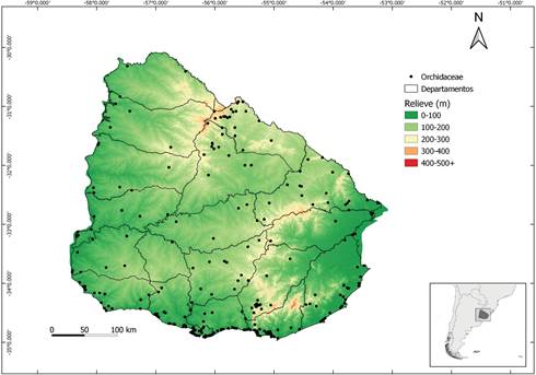 El presente inventario de especies se obtuvo mediante una amplia revisión de las publicaciones sobre Orchidaceae de la región Uruguayense (Herter 1930, Pabst 1952, Correa 1953, 1955, 1969, Izaguirre 1972, 1973, 1985, 2010, 2013, Pabst & Dungs 1977, 1975, Garay 1982, Lombardo 1984, Szlachetko 1996, Pridgeon et al. 1999, 2003, Szlachetko, Gonzalez-Tamayo & Rutkowski 2001, Hurrel et al. 2009, Salazar et al. 2009, 2018, Mytnik- Ejsmont, Szlachetko & Gorniak 2010, Schinini 2010, Batista, Bianchetti, Gonzalez-Tamayo, Figueroa & Cribb 2011a, 2011b, Buzatto, Singer, Romero-Gonzalez, Van den Berg & Salazar 2013, 2014, Marchesi et al. 2013, De Azevedo, Van Den Berg & De Barros, 2014, Martos, Johnson, Peter & Bytebier 2014, Radins, Salazar, Cabrera, Jimenez-Machorro & Batista 2014, Rossado, Mai, Bonifacino & Waechter 2014, Andrade et al. 2018, Castro & Singer 2018, Mai et al. 2019, Pessoa & Alves 2019, Buzatto, Singer, van den Berg, de Souza & Mota 2020), bases de datos virtuales como la Flora del Cono Sur (2020), Govaerts et al. (2020), IPNI (2020), Reflora (2020), The Plant List (2020), Tropicos (2020) y visitas a los herbarios del país y extranjeros de relevancia para el grupo, BAF, HBG*, ICN*, K*, MVFA, MVFQ, MVHC, MVJB, MVM, P*, SI, SP* (“*” consulta virtual). Se consultaron bases de datos en línea y literatura para revisión de la nomenclatura y obtener la distribución de las especies en países de América del Sur.