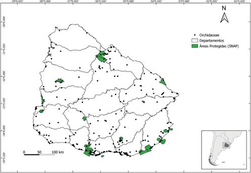 En áreas de conservación, con base en los análisis de los mapas de ocurrencia de especies en relación al Sistema Nacional de Áreas Protegidas (SNAP 2020), fueron encontradas 29 especies, sobresaliendo los Humedales de Santa Lucía (13 spp.), Valle del Lunarejo y Laureles Cañas (11 spp.) y Montes del Queguay (9 spp.). En total ca. del 50% de las especies esta representada en alguna de estas área, resaltando así, la importancia de la conservación de Orchidaceae (Fig. 13).