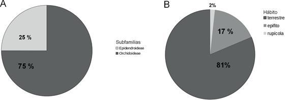 Se obtuvo que la familia Orchidaceae en Uruguay está representada por 59 especies en 18 géneros (Fig. 3-4). Entre ellos, 48 especies son de hábito terrestre, 10 presentan hábito epifito y una especie rupícola (Cyrtopodium brandonianum Barb.Rodr.) (Fig. 5 A-B). Además, se obtuvo un total de cuatro especies endémicas, distribuidas en los ambientes BR, BS, BC y P (Tabla 2), 37% (22 spp.) se encontraron restringidas en la zona del Cono Sur (Argentina, sur de Brasil y Uruguay) y 61% (36 spp.) considerando a Paraguay [utilizando el concepto de endemismo con flexibilización de los criterio de restricción, dentro de los límites administrativos de un país (De Candolle 1855, Ferreira & Boldrini 2011)]. De las 5 subfamilias que existen a nivel mundial, se obtuvo representantes de dos subfamilias Epidendroideae con 15 especies (25 %) y Orchidoideae con 44 especies (75 %) (Fig. 6). Donde Orchidoideae resultó ser la más representativa ya que presentó especies de tres tribus que son: Chloraeeae (7 spp.), Orchideae (12 spp.) y Cranichideae (25 spp.). Dentro de Cranichideae la mayor subtribu es Spiranthinae con 23 especies (39 %).