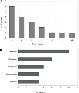 Los géneros que presentaron mayor cantidad de especies fueron Habenaria Willd. (12 spp.), Cyclopogon C.Presl. (8 spp.), Brachystele Schltr. (6 spp.), Bipinnula Comm. ex Juss. (5 spp.) y Skeptrostachys Garay (5 spp.). Además se obtuvo que un 33% de los géneros presentes en el país solo están representados por una especie; mientras que el 72% restantes incluyen hasta un máximo de tres especies (Fig. 7 A-B).