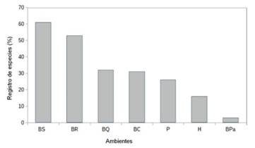 Los ambientes que reflejaron mayor diversidad (Fig. 8 y 9, Anexo 1) fueron BS (61%) y BR (53%) seguidos de BQ (32%), BC (31%). La posibilidad de sobrevivencia de especies de hábito terrestre y epifito son factores que pueden estar relacionados, siendo encontradas en estos ambientes 5 de las 10 especies epifitas en BS y 9 spp. en BR. La existencia de legislaciones antiguas de protección a bosques nativos (Ley Nº15939, 1987) colaboran de forma parcial en su conservación (Rivas 2010). Por otro lado, la mayoría (20 spp.) de las especies que ocurren son de amplia distribución o pueden encontrarse en otros ambientes como BQ y BR. La eco-región que presentó menor diversidad y riqueza de especies fue BPa (3 %) siendo también uno de los ambientes de menor extensión en el país (Evia & Gudynas 2000) que junto con las zonas húmedas, es intensamente amenazado por las prácticas de agicultura como el cultivo de arroz y el sobrepastoreo en la ganadería (Rivas 2010).