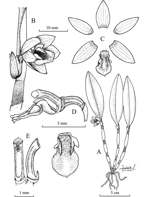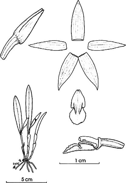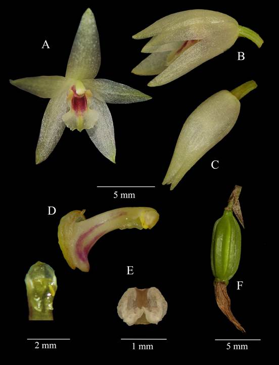 Plant large, up to 33 cm tall, epiphytic, shortly repent. Rhizome stout, 6-8 mm thick, 6-12 mm long between ramicauls. Roots slender, flexuous, 1 mm in diameter. Ramicauls stout, suffused with purple, erect, 12-20 cm long, compressed, ancipitous below, with 4-5 internodes enclosed by imbricating, tubular sheaths, the lower one shorter than the others, which tear with age. Leaf erect, coriaceous, narrowly elliptical to lanceolate, 15-22 × 2.5-3.5 cm, cuneate below into a 1.0-1.5 cm long petiole, the mid-vein sulcate adaxially and slightly carinate abaxially, margin entire, involute, apex tridentate, and slightly acuminate. Inflorescence 1-3 single simultaneous flowers in a fascicle from the apex of the ramicaul, cleistogamous, rarely partially opened, peduncle cylindrical, 1.0-1.5 mm long; floral bract tubular, 3 mm long; pedicel cylindrical, 4 mm long; ovary 5-6 mm long, terete, longitudinally sulcate. Sepals translucent white-colored, with yellowish- green apex, free, glabrous, slightly concave. Dorsal sepal elliptical, acute 1.0-1.2 × 0.3-0.4 cm, 5-veined. Laterals sepals, elliptical, acute, slightly oblique, 1.0-1.2 × 0.3-0.4 cm, 5-veined. Petals translucent white, elliptic to ovate, apex yellowish green, acute, 0.8-0.9 × 0.3-0.4 cm, 3-veined. Lip whitish yellow, the disc marked with red-purple, glabrous, oblong-trilobed, erose margins towards the apex, 5-6 × 3-4 mm, the lateral lobes erect, oblique, rounded at the tip, antrorse; the middle lobe, broadly spatulate, broadly tridentate at the apex, the margins minutely erose, the disc with a pair of longitudinal calli born close to the base which extend up to the second third of the lip; the base broadly truncate, hinged to the tip of the column foot. Column white semiterete, 3.5-4.0 mm long, stigma ventral, with two short, fang-like structures at the lower side of the stigma, clinandrium slightly irregular, rostellum vestigial. Anther cap subapical 1.0 × 0.8 mm, white. Pollinia 8, in 2 sets of 4, yellow. Fruit cylindrical to fusiform with three longitudinal keels, 6 × 3 mm.