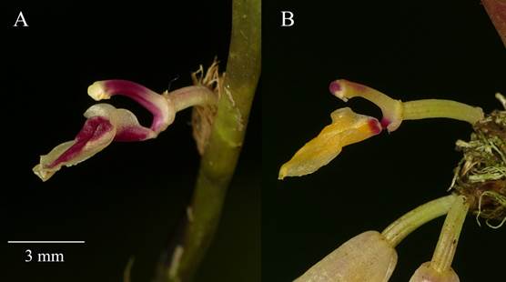 Specimens were collected during a comparative study on the orchids of the Cordillera del Cóndor. Some of these were grown and photographed at the Orquideario la Paphinia in Zamora, Ecuador. The measurements of the vegetative and floral parts were made from living material. Photographs were taken using a Panasonic® FZ300 or Canon® EOS 1100D camera and Raynox DCR-150 50 mm, EFS 18-58 mm, and +10 Kernel Pro Optics 58 mm close-up lenses. The new species were compared to those previously described (Luer 2010, Luer 2011).