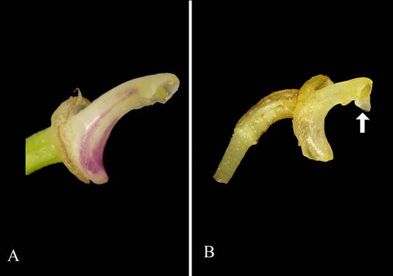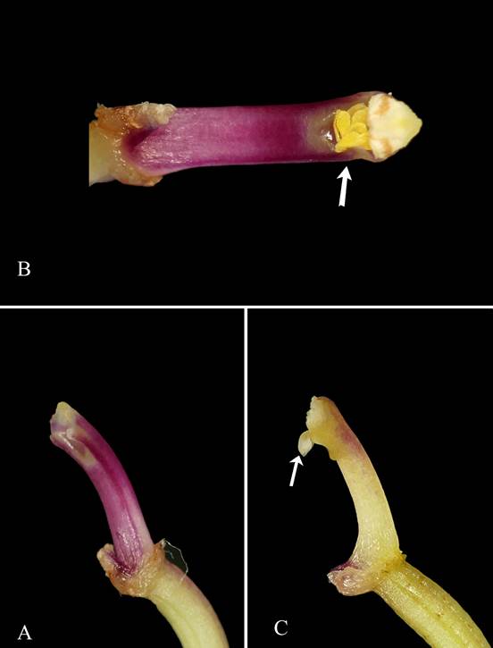 About one year ago, we tracked the species, and we observed capsule production in all flowers that caught our attention. Therefore, four specimens were cultivated for eight months, and the same seed pod production was observed without withering of any flower. While dissecting the flower of the species for the line drawing, it was noted repeatedly that the pollinia easily entered the stigma (Fig. 4B). This because flowers lack a prominent rostellum that prevents self-pollination (Catling 1991) as in other Octomeria species (Fig. 4). Octomeria pacii has a vestigial rostellum (Fig. 4A) and we assume that it could influence the successful production of capsules in each flower. In the future, it should be demonstrated if the species is self- pollinated and if the seed are viable.