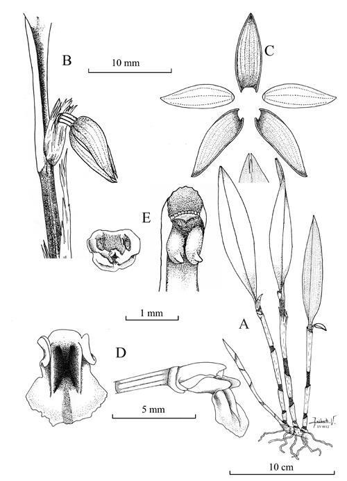 Plant medium in size, up to 23 cm tall, epiphytic, caespitose. Roots slender, undulated, 1 mm in diameter. Ramicauls stout, erect, 8-14 cm long, ancipitous below, with 3-5 internodes enclosed by imbricating, tubular sheaths, the lower sheath shorter than the rest. Leaf erect, coriaceous, narrowly elliptical 8-15 × 1.5-2.5 cm, sulcate adaxially and slightly carinate abaxially, margin entire, apex acute, cuneate below into a 0.5-1.5 cm long petiole. Inflorescence single-flowered, produced from a fascicle at the apex of the ramicaul, peduncle cylindrical 1 mm long; floral bract tubular, 3 mm long; pedicel cylindrical, 2 mm long; ovary 3.5-4.0 mm long, terete, longitudinally sulcate. Sepals translucent white suffused with magenta, free, glabrous. Dorsal sepal ovate, subacute 9-11 × 5-6 mm, 5-veined. Laterals sepals free, ovate, acute, 9-11 × 3-4 mm, 5-veined, oblique. Petals translucent white with suffused with magenta, elliptical-ovate, acute, 10-11 × 3-4 mm, 3-veined. Lip white, marked centrally with magenta, glabrous, panduriform, trilobated, with erose apical margins, the apex minutely cuspidate, 6.0 × 3.5 mm; the lateral lobes erect, oblique, subacute, antrorse, below the middle, the disc with a pair longitudinal, slightly crooked calli emerging at the middle; the base broadly truncate, hinged to the column-foot. Column red-purple, semiterete, ribbed longitudinally at each side, 3.0-3.5 mm long; the anther subapical and a ventral stigma, clinandrium slightly irregular, rostellum vestigial, foot 0.2-0.3 mm long. Anther cap white. Pollinia yellow, 8, in 2 sets of 4.