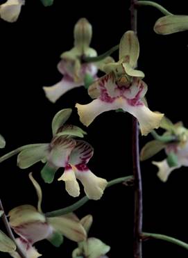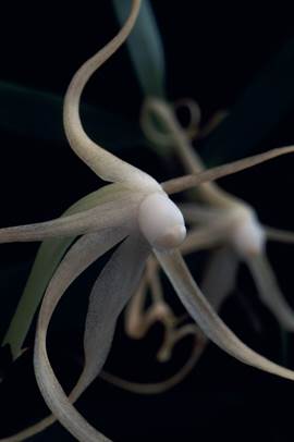 The delimitation of this species; its subspecies, varieties and other forms has been debated for centuries with flower colour, lip shape, length of spur and column shape as the most frequently used characteristics (Lindley, 1832; Hooker, 1854; Rolfe, 1897; Senghas, 1979). It is a very widespread and variable species found in a variety of habitats ranging from coastal cliffs, as an epiphyte in moist evergreen forest, a terrestrial in dry deciduous forest and on dry exposed rock. These factors undoubtedly have led to a great deal of variation. To ascertain its variability 220 herbarium specimens of the species and its variants from different localities were measured, tabulated and compared. Combined with photographic and field observations, we conclude that there is no obviously correlation between plant habit, the size and shape of the leaves and the flowers except in Angraecum eburneum subsp. xerophilum H.Perrier. Flowers from Madagascar show the greatest variability, both in lip shape and spur length ranging from 6 to 19 cm (and longer if Angraecum longicalcar is taken into account); flowers from Réunion have a lip that is fairly consistently a little longer than wide with a spur between 5 and 10 cm long, the limited number of plants from Mauritius seem similar to those from Madagascar. Flowers from the Comoros are similar to those from Madagascar but the spur is often longer, flowers from mainland Africa have a lip as long as wide and a short spur. The lip, often used as a distinguishing feature, is greatly variable in size and shape with individual plants and colonies having a rounded or angular lip. It has also been observed that the lip shape changes and becomes more angular as the flowers mature. The length of the spur is also very inconsistent with numerous intermediate forms between the extremes. Flower colour is also quite variable and changes as the flowers mature.