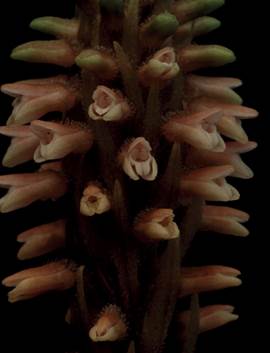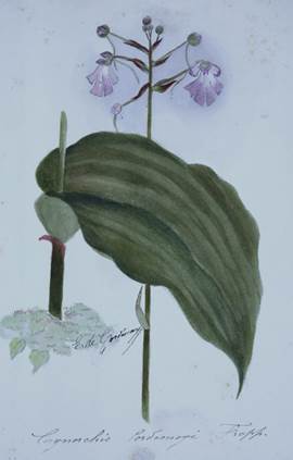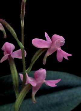 Perrier described Gymnochilus roseum in 1936 from Eastern Madagascar but expressed doubt as to which genus it belonged, since then it has been transferred to Bathieorchis and Goodyera but with its typical broad floral bracts and lip with basal calli it clearly belongs in Platylepis. When comparing the descriptions, drawings and dissecting of herbarium material and field observations it is clear that this is the same as Platylepis margaritifera: habit, size of the leaves and flower size are well within the variability of the species, Schlechter’s drawing shows a flower with the segments spreading instead of campanulate but this was undoubtedly distorted during the analysis. His drawing has the typical elongate lip with a small triangular epichile, two longitudinal keels at the base and the characteristic calli at the base, variously described as ‘seven, pearl-like calli’ by Schlechter and ‘six to ten golden pedicellate glands’ by Perrier; existing herbarium material confirms them to be more or less rounded calli. It occurs in Madagascar and Réunion.