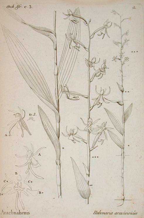 2. Habenaria arachnoides Thouars, Hist. Orchid.: Table 1, e. 3., t. 18 (1822). Fig. 72-73.