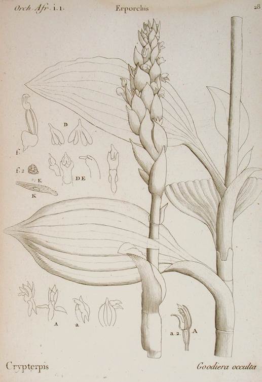 Goodyera occulta Thouars, Hist. Orchid.: t. 28 & 30 (1822), as Goodiera.