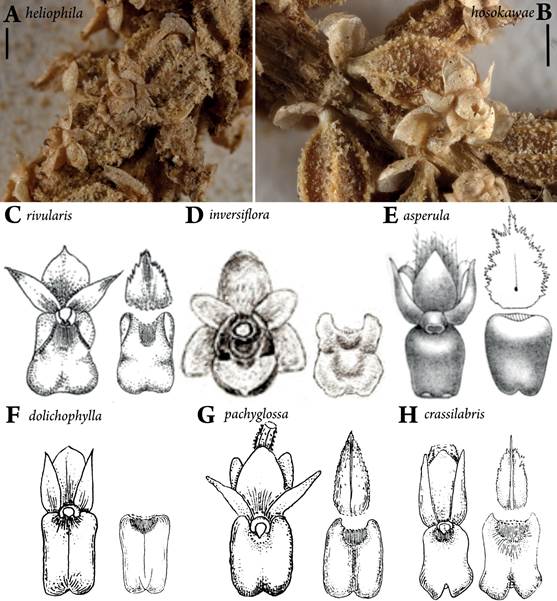 Remarks.- The section Scytoxiphium serves to illustrate some of the points made above. As the first sign of overnaming, Schlechter (1911: 176, translated from German) noted that “The establishment of boundaries of the species is difficult, because they are all closely related.” Schlechter (1911) described in his new section O. pachyglossa and O. crassilabris from New Guinea and included O. dolichophylla Schltr. and O. rivularis Schltr. both previously described from New Guinea, O. heliophila Rchb.f. from Fiji, and O. betchei Schltr. from Samoa, but not O. asperula J.J.Sm. described previously from New Guinea (Smith 1908: see below).