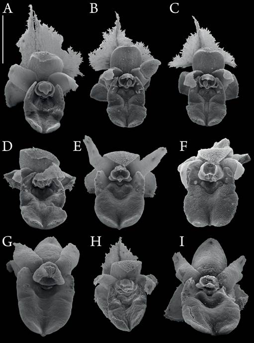 Taxonomic assessments were made based on available information from primary and secondary literature, herbarium holdings (B, BM, F, K, MEL, MICH, MO, P, SING, US, W), and on-line databases (HBG, L). Illustrations were processed in AffinityPhoto. Z-stack photography was carried out on a Zeiss Discovery V20 stereomicroscope with planapochromatic lenses and motorized focus. Images stacks were captured with a Zeiss Axicocam HRc camera and processed in ZereneStacker. For scanning electron microscopy (SEM), flowers were preserved in 95% ethanol, brought to 100% ethanol through three changes of 100% ethanol, critical point dried in a Tousimis 815A using standard settings, then mounted on double sided carbon tabs (Ted Pella), sputter coated with gold, and imaged in a Zeiss EVO 40 XVP using the VPSE detector in variable pressure (30 Pa) at 20 kV and probe currrents ranging from 30-500 pA depending upon working distance and magnification.