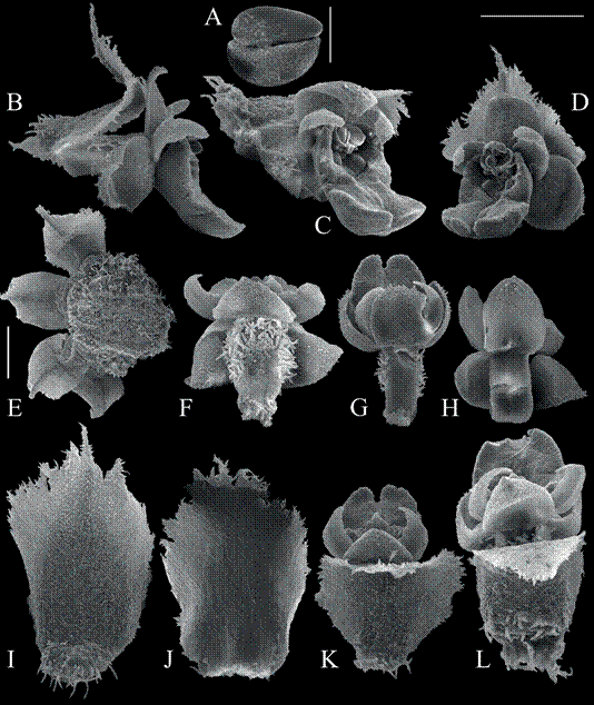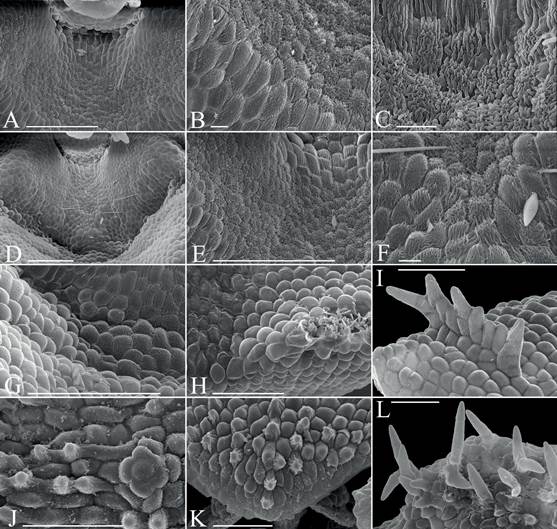 Cell surface morphologies consisting of striate around disc (Fig. 5C, E), coarsely rugulate around mesochile end, central portion of epichile (Fig. 5C, F), finely rugulate on main portion of mesochile and epichile (Fig. 5A, B, G), glabrous pneumate at tips of epichile (Fig. 5H). Short rugulate trichomes on the backside of the sepals (Fig. 5J, K), longer uniserial trichomes at base of bract (Fig. 5L).