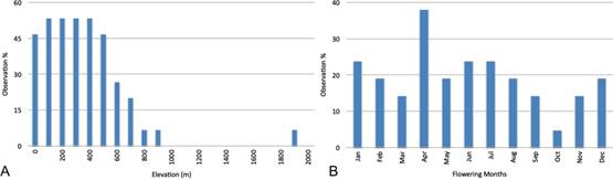 Oberonia heliophila is found regularly from sea level to about 500 m, with decreasing frequency to 900 m (Fig. 7A). The single record from 1900 m (Comber 1373 K s.n. from Java) needs verification. The elevation at the named location matches the indicated elevation based on GoogleEarth. That record could be mislocalized. However, a photograph by Mark Clements of the species was taken around Simbai, New Guinea, which is at approximately 1900 m elevation, including its surroundings (Fig. 4E).