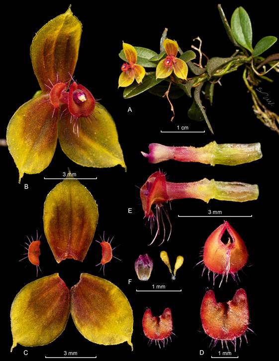 Plant epiphytic, ascending, up to 3.5 cm tall. Rhizome up to 2.3 mm between ramicauls. Ramicaul abbreviated, terete, 3.1-3.4 mm long, enclosed by 2 tubular, ribbed sheaths. Leaf erect, elliptic, up to 13.9 × 3.7 mm, the apex emarginate with an abaxial mucro, the base cuneate into a petiole ca. 1 mm long. Inflorescence a lax, successively few flowered raceme up to 12 mm long including the slender peduncle, floral bracts conical, acute, 0.9 mm long, pedicels 2.4 mm long. Ovary yellowish green, terete, costate, 1.9 mm long. Flowers with the sepals yellow with a scarlet basal, central blotch; the petals scarlet-orange and the lip amber with scarlet margins; the column scarlet with a white and burgundy apex, the anther cap white and burgundy. Sepals 3-veined, puberulous, sparsely erose, shortly caudate, abaxially carinate along the central vein; dorsal sepal sub-obovate, shallowly concave, 5.5 × 3.3 mm, almost free; lateral sepals broadly obovate to elliptical, 5.3 × 3.5 mm connate for ca. 1.2 mm. Petals reniform, puberulous, sparsely long ciliate, unguiculate, obtuse, 0.6 × 1.3 mm. Lip sub-reniform and laterally constricted when expanded, 3-veined, puberulous, long ciliate, rounded, 1.8 × 1.8 mm expanded, with short, erect, narrowly obtuse basal lobes embracing the column, abaxially with a group of long hairs along the mid vein up to 1.8 mm long, adnate to the apical third of the column. Column terete, slightly dilated apically, microscopically pubescent, 2.9 mm long including the rostellum, anther apical, stigma apical, rostellum antrorse. Pollinia two, yellow, pyriform, with a viscidium. Anther cap elliptic, cucullate, white at the base, and vinaceous towards the top.