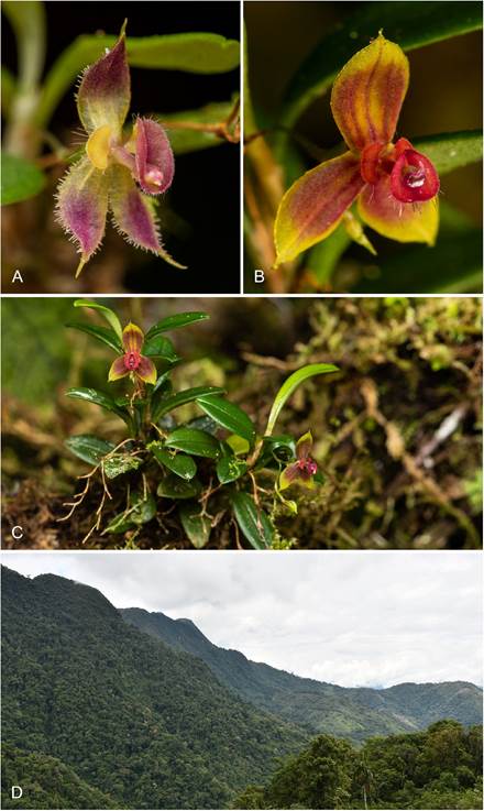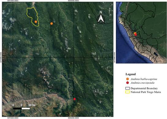 Andinia barba- caprina grows in secondary forests of the “yungas fluviales” ecoregion, distributed in the eastern side of the central cordillera of the Peruvian Andes, in caserío Corazón de Jesús, province of Leoncio Prado, Huánuco (Fig. 3), at an elevation of 1590 m. It has been found growing as an epiphyte in the bark of Cyathea andina Domin, in a very humid montane forest (Fig. 2D). It has also been reported in the Tingo María National Park, which is located within a steep area in the chain of mountains known as Bella Durmiente, 10 km from the locality of the type, where it grows as epiphyte on branches of bushes, in sympatry with Andinia tingo- mariana. It was observed that the flowering of this species occurs between September and October.