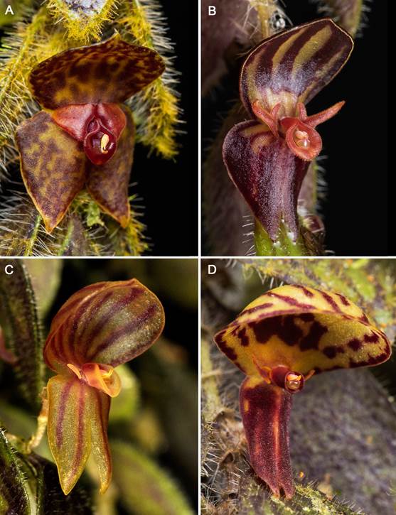 Andinia barba-caprina belongs to the Andinia subgenus and is most similar to the recently described A. tingomariana, both from a vegetative and floral point of view, sharing traits such as abbreviated ramicauls, erect leaves, reniform and puberulous petals with long ciliated margins and a column terete, microscopically pubescent and slightly dilated at the apex. However, Andinia barba-caprina is clearly distinguished from A. tingomariana by presenting yellow flowers with a central scarlet basal spot (vs. light yellow and apricot flowers), sub-obovate dorsal sepal with slightly erose margins (vs. eliptic, entire), broadly obovate lateral sepals with slightly erose margin (vs. elliptical, ciliate) and the lip with narrowly obtuse, short basal lobes (vs. long basal lobes, oblong to narrowly triangular) and abaxially with a group of long hairs (vs. briefly ciliate). (Fig. 2).