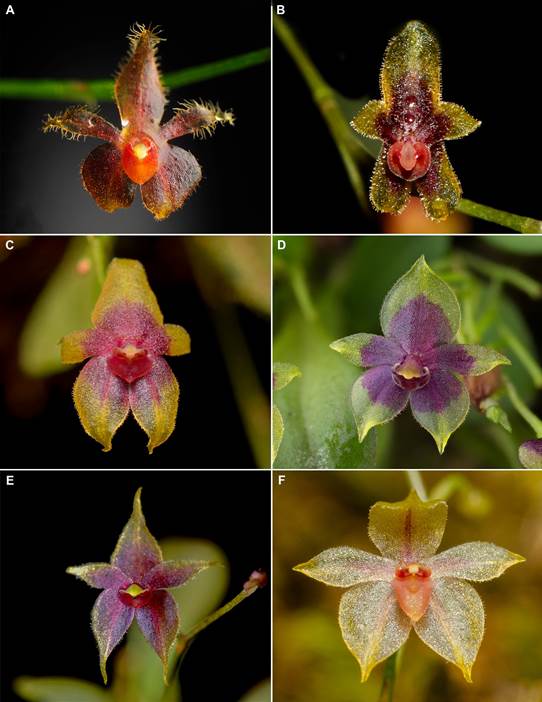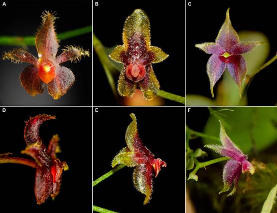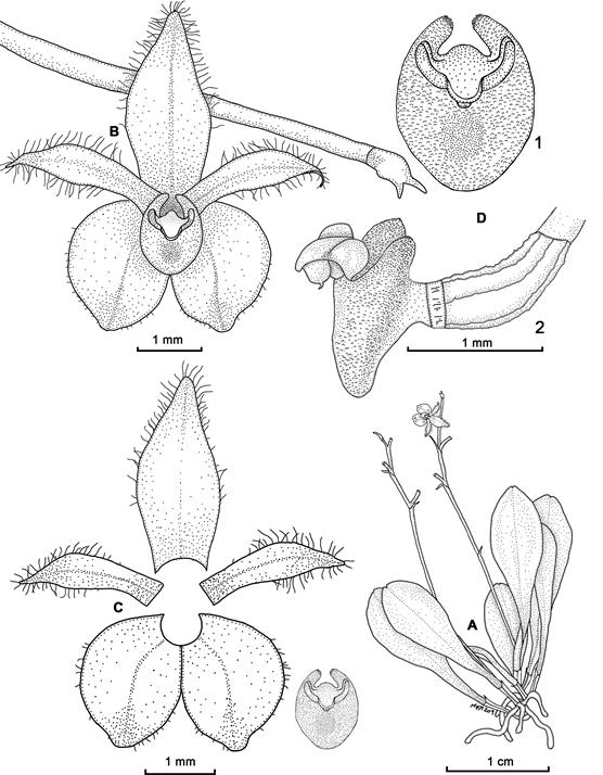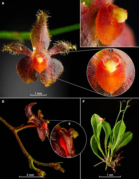 Plant small, epiphytic, caespitose herb, up to 5 cm including inflorescence; roots slender ca. 0.3 mm in di ameter. Ramicauls erect to suberect, slender, 3-4 mm long, enclosed by 1-2 thin, ribbed, imbricating sheaths. Leaf erect to suberect, coriaceous, obovate, with the base narrowly attenuated into a petiole, 2.0-3.0 × 0.7-1.1 cm. Inflorescence erect and successively-flowered raceme, 3-5 cm long, including filiform peduncle 0.5 cm long, emerging low from the ramicaul; floral bracts acuminate, 1 mm long; pedicels 2.5 mm long. Ovary 6-ribed, 1 mm long. Sepals vermilion to vinaceous, glabrous towards the basal half and sparsely pubescent towards the apex, ciliate on the margins. Dorsal sepal broadly oblong, attenuate, long ciliate in the margins, subconvex, 1-veined, 2.0-2.5 × 1.5 mm. Lateral sepals broadly ovate, obtuse, slightly ciliate in the margins, connate at the base, 1-veined, 2.0 × 2.5 mm. Petals vermilion to vinaceous, oblanceolate, subfalcate, glabrous, acute, 2.0 × 1.0 mm, 1veined, longciliate from the middle to the apex. Lip flame-colored, oblong, elliptical, cellular-glandular, small deltate glenion at the base, with a rounded apex, 1.1 × 0.9-1.0 mm, with the rounded base inflexibly attached to the column. Column flame-colored to cream, short, incurved, stout semiterete 0.6 × 0.5 mm, anther ventral with the stigma subapical, reflexed, transversely bilobed on each side of the anther, the foot rudimentary. Anther cap yellowish, obovate, cucullate, 0.3 mm long. Fruits not seen.