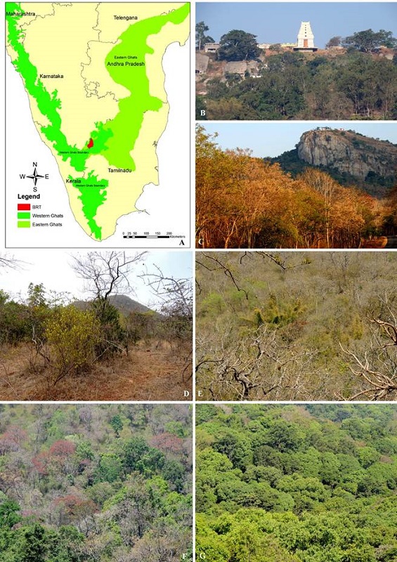 Study area.- The BRTTR (also wildlife sanctuary) is located between 11-13◦ N and 77-78◦ E in the Chamarajanagar district of Karnataka state, India (Fig. 1A). It is spreading in five ranges viz., Yelandur, Kollegal, Kyathadevara Gudi (K.Gudi), Bylore, Punajur under three taluks such as Yelandur, Kollegal and Chamarajnagar covering an area of 574.82 sq. km. The BRTTR comprises two main hill ranges running in the north-south direction contiguous with the Sathyamangalam Tiger Reserve in the adjacent Tamil Nadu state. The entire Biligirirangan hill range belongs to one geomorphic unit. These are structurally controlled mountain ranges with steep slopes, valleys and narrow gorges (Blatter & Srikantappa 1996). The elevation varies between 600 to 1825 m. The western hill range includes many hills with an average elevation of 1350 m. The eastern range consists of chain of hills with an average elevation of 1650 m. Kattaribetta is the highest peak reaching 1825 m elevation. The terrain is undulating with a network of valleys and west flowing streams. The hill ranges receive both the South-West monsoon and North-East monsoon rains with an average rainfall of 650 mm (range 600-3000 mm) in the low-lying plateaus, and 1990 mm in the higher elevations. The annual temperature ranges between 18-38◦ C. Due to its geographical location between western ghats and eastern ghats, and variation in topographical and climatic factors, BRTTR hosts a diversity of habitats within its boundaries including scrub forests, dry and moist deciduous forests, semievergreen and evergreen forests and the climax vegetation Sholas at higher elevation (Fig. 1-2). The valleys of hills provide ideal habitat for evergreen forests and few coffee plantations are located in this area. BRTTR is also known for its rich faunal diversity and the habitat for charismatic species like tigers and elephants. It was declared as Tiger Reserve in 2011. It is also home to the Soliga tribes, a forest dwelling indigenous communities of about 2900 families (~12,250 people) living in 63 hamlets in and around the reserve (Lingaraja et al. 2017).