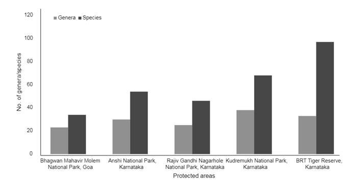 In the present documentation, a total of 97 orchid species are recorded under 33 genera from BRTTR. Out of the total species, 47 are epiphytic, and 50 are terrestrial, including one mycoheterotrophic orchid; Epipogium roseum, and a climbing, leafless orchid; Vanilla walkerae. The genus Habenaria is the dominant genera with 20 species, followed by Eria (10 spp.), Oberonia (7 spp.), Dendrobium (6 spp.), Peristylus (6 spp.) and Bulbophyllum (5 spp.). The occurrence of 97 species of orchids in the present study area demonstrates the orchid diversity of this reserve, which contributes to almost 49% of the total orchid flora of Karnataka state. A comparison of orchid diversity in other protected areas based on published literature is also provided (Fig. 3).