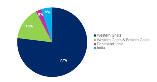 Endemic orchids of BRTTR.- A total of 39 endemic orchid species under 13 genera are found in BRTTR. The genus Habenaria and Eria are the dominant genera having more endemic species. Almost 40% of the orchid species documented in BRTTR are endemic either to Western Ghats, Eastern Ghats, Peninsular India or India. 77% of the endemic orchids in BRTTR are endemic to Western Ghats (Fig. 4) mainly concentrated in high rainfall areas like evergreen and shola forests. In addition, 57% of endemic epiphytic orchids are also found in the high-altitude (above 1200 m) evergreen and shola forests, which makes them very important habitat for conservation. Table 1 provides the list of endemic species.