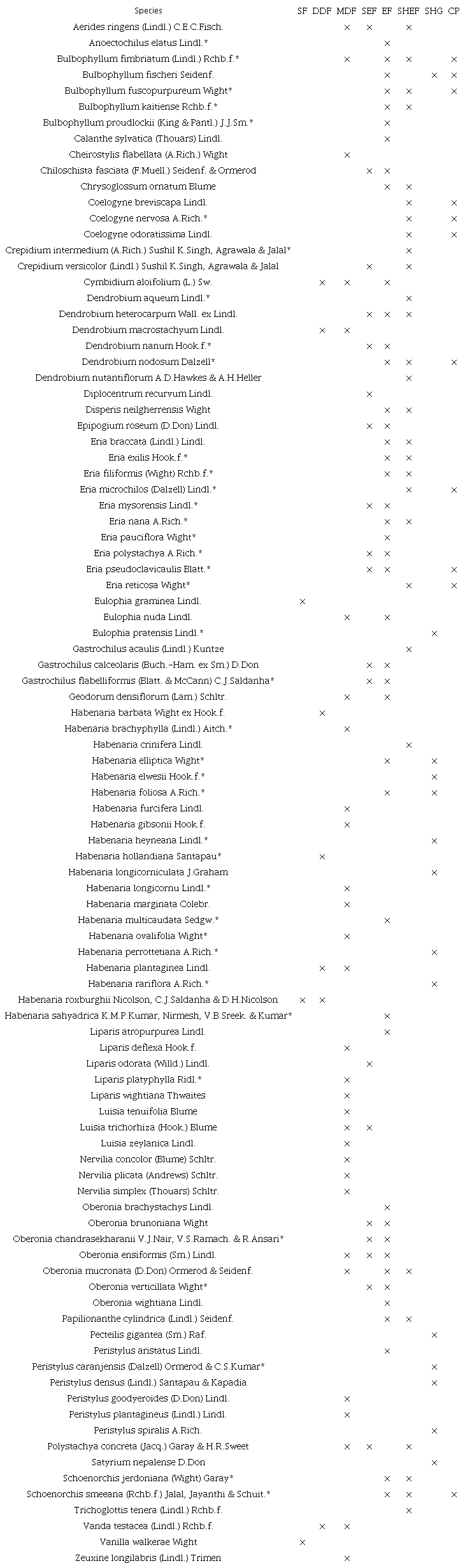 Diversity of orchid host species.- In BRTTR, several tree species are found to be good phorophytes for epiphytic orchids. Their trunk with rough bark, branches heavily laden with mosses, lichens, and crevices with thin layers of humus form suitable substrata for orchids. These epiphytic orchids are often associated with other epiphytes such as Hoya pauciflora Wight, Aeschynanthus perrottetii A.DC., ferns, mosses, lichens etc. Some common host trees and shrubs are, Artocarpus heterophyllus Lam., Bischofia javanica Blume, Careya arborea Roxb., Catunaregam spinosa (Thunb.) Tirveng., Celtis tetrandra Roxb., Citrus medica L., Dalbergia lanceolaria L.f., Dalbergia latifolia Roxb., Elaeocarpus tuberculatus Roxb., Ficus racemosa L., Ficus virens Aiton, Garuga pinnata Roxb., Grevillea robusta A.Cunn. ex R.Br., Lagerstroemia parviflora Roxb., Machilus glaucescens (Nees) Wight, Mangifera indica L., Melia azedarach L., Meliosma simplicifolia (Roxb.) Walp., Meyna laxiflora Robyns, Neolitsea zeylanica (Nees & T.Nees) Merr., Olea paniculata R.Br., Phyllanthus emblica L., Platycladus orientalis (L.) Franco, Psydrax dicoccos Gaertn., Pterocarpus marsupium Roxb., Radermachera xylocarpa (Roxb.) Roxb. ex K.Schum., Symplocos acuminata (Blume) Miq., Syzygium cumini (L.) Skeels, Syzygium jambos (L.) Alston, Sterculia guttata Roxb. ex DC., Sterculia urens Roxb., Terminalia anogeissiana Gere & Boatwr, Terminalia bellirica (Gaertn.) Roxb., Terminalia chebula Retz., Terminalia elliptica Willd., Tetrapilus dioicus (Roxb.) L.A.S.Johnson and Wendlandia thyrsoidea (Roth) Steud.