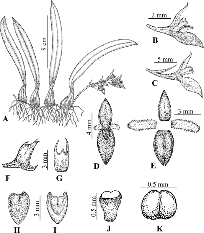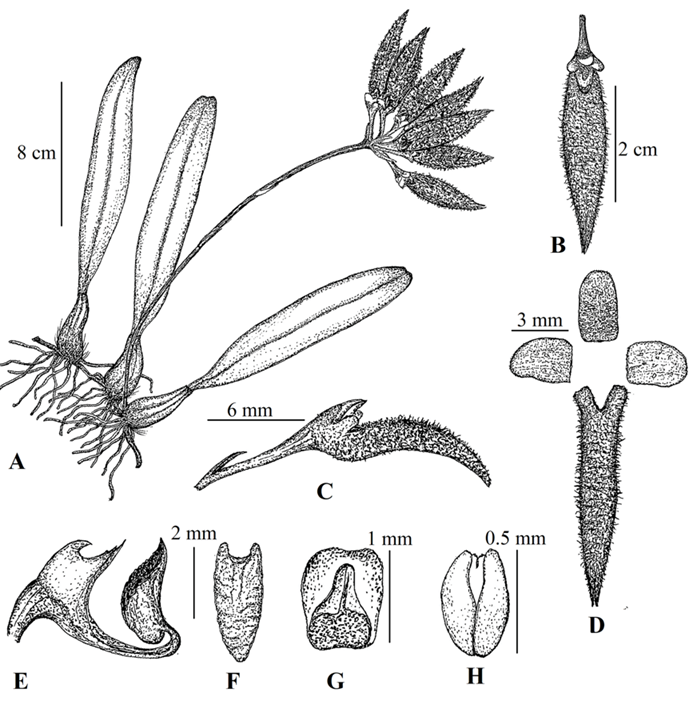 Plant epiphytic with creeping rhizomes and spreading roots. Rhizome terete, 1.4-1.8 mm diam., brown, sections between two pseudobulbs 3-7 cm long, arising from the basal node of the pseudobulb; rhizome scales thick, weathering to woolly fibers, persistent. Pseudobulbs 1-leaved, narrowly ovoid to ovoid, 1-3 × 0.6-1.5 cm, green to yellowish green, with numerous light green to almost white terete roots densely clustering at base; young pseudobulbs smooth, with partially disintegrated papyraceous or membranous sheaths, longitudinally ridged when mature. Leaf subsessile; petiole narrowing into short conduplicate petiole-like base 3.5-4 mm long; blade oblong, narrowly oblanceolate, 13-16 × 1-2 cm, leathery, apex acute or shortly acuminate, adaxially dark green, abaxially light green with a prominent dark green median vein. Inflorescences pendent, short dense-flowered raceme, 7-9 flowered; peduncle stout, slightly arched, ca. 1 cm long, green, glabrous, with 2-4 bracts, young light green and turning into brown with maturity, spirally arranged flowers. Floral bracts lanceolate, 4.5-5.0 × 1-2 mm, concave, light green or almost white, coriaceous, glabrous. Pedicel and ovary 1.8-2.1 mm long, greenish yellow to pale brown-purple, ovary distinctly broader than pedicel, longitudinally grooved. Flowers non-resupinate, not widely opening, sepals and petals purple, labellum pale yellowish with purple tint on the disc; sepals concave, apex acute or narrowly acute; petals flat, abaxially with sparse short and maroon papillous hairs. Dorsal sepal ovate, 4.8-5.0 × 2.3-2.6 mm, with recurved acute apex, shortly setose-ciliated margin towards the apex, 3-nerved. Lateral sepals obliquely ovate, 5-6 × 2.8-3.0 mm (when flattened), connate along lower edges completely or partly free at base and apex, 3-nerved. Petals oblong, 2.8-3.0 × 1.0-1.5 mm, rounded to obtuse apex, margin ciliated, with 1 prominent median vein. Labellum ovate 2.5-3.0 × 1.8-2.1 mm, fleshy, recurved and slightly grooved near the base, simple, sparsely verruculose in apical half adaxially, apex rounded to obtuse, with short setose hairs, side lobes absent. Column terete, 2.8-3.0× 1-2 mm, white, with distinct down and forward di-rected foot ca. 1.5 mm long. Stelidia triangular, 0.5-1.0 mm long, pointing forward, exceeding operculum; operculum oblong, ca. 1.0 × 0.5 mm, yellow, surface densely verruculose, apex obtuse. Pollinia 4, ovoid, ca. 0.5 mm long, yellow. Fruits unknown.