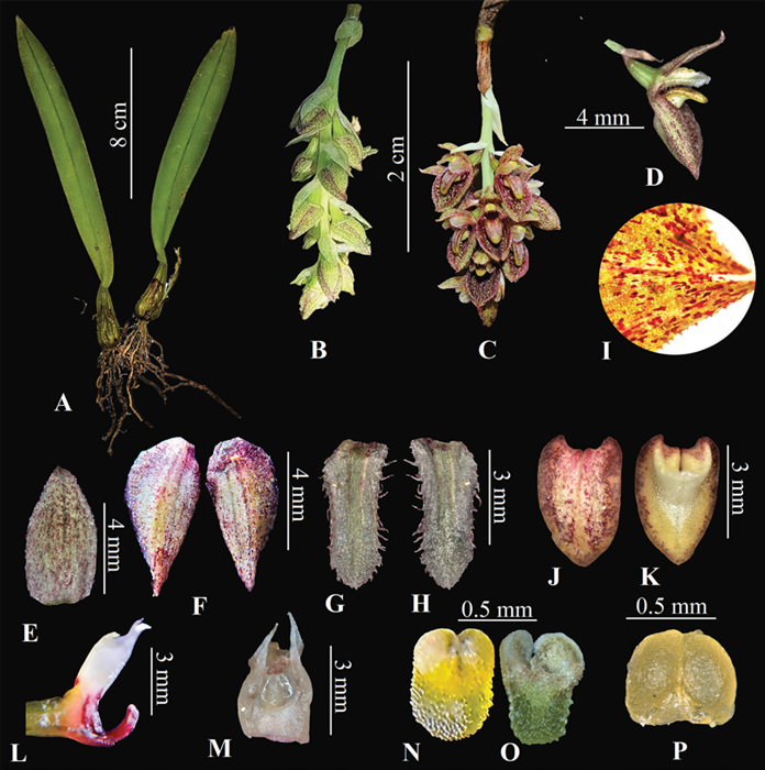 Plant epiphytic with creeping rhizomes and spreading roots. Rhizome 0.4-1.8 mm diam., brown, arising from the base of the pseudobulb, pseudobulbs placed at 1.5-6 cm long intervals, rhizome covered with thick scales that weather to woolly fibers, persistent. Pseudobulbs 1-leaved, narrowly ovoid to ovoid, 2.5-4.5 × 1.0-1.5 cm, green to yellowish-green with numerous light-green to almost white cylindrical roots densely clustering at the base, covered with partially disintegrated membranous sheaths, longitudinally ridged, with many numerous white roots densely clustering at base. Leaf 1, oblong-lanceolate, 6-16 × 1.0-2.3 cm, apex acute or shortly acuminate, coriaceous, adaxially dark green, abaxially light green with prominent dark green median vein, margin entire, apex rounded, slightly retuse. Petiole short conduplicate, 3.5-5.0 mm long. Inflorescence a subumbellate raceme, 5-12-flowered, arising from the base of the pseudobulb; peduncle horizontal or pendulous, 10-18 cm long, with 3 to 4 brown tubular overlapping bracts at base and 1-3 distant bracts in middle part, green, glabrous, young bracts are light green when young and turning brown with maturity. Floral bracts narrowly lanceolate, 5-8 × 1-2 mm, concave, white, herbaceous, glabrous, apex acuminate. Pedicel and ovary 0.8-1.0 cm long, pedicel pink, slender, slightly curved, ovary golden green with maroon stripes, thicker, glabrous, longitudinally grooved. Flowers resupinate, not widely open, lateral sepals maroon; median sepal, petals and labellum white with purple patches. Dorsal sepal oblong-ovate, 3.8-4.1 × 2-3 mm, apex obtuse, with short papillose margin abaxially densely papillose on basal concave part, sparsely papillose towards apex, 3-nerved. Lateral sepals narrowly lanceolate, 1.5-3.2 × 0.3-0.4 cm, obtuse, twisted at base, upper margin incurved and connate along the margin, free at lower margin, adaxially glabrous, abaxially densely papillose at base, sparsely papillose above base. Petals oblong-lanceolate, 3-4 × 2-3 mm, obtuse, slightly convex, adaxial surface glabrous, slightly oblique sparsely papillose on abaxial surface apex obtuse, shortly ciliate, with 1 prominent median vein. Labellum simple, narrowly ovate in outline, 3 × 1.5 mm, recurved, with rounded apex, with short papillate hairs on margin and apex, base with transverse callus and small appendage joining to column foot. Column broadly ovoid, ca. 1.5 mm tall, maroon, with forwarded and strongly incurved foot ca. 3 mm long, strongly incurved. Stelidia broadly subulate, ca. 0.5 mm long, sometimes with a small branch near the apex; operculum helmet-shaped, ca. 1 mm tall, maroon; pollinia 2, flat, ovoid, 0.5 mm long, yellow. Capsule clavate, 2 × 0.5 cm, glabrous, longitudinally grooved.