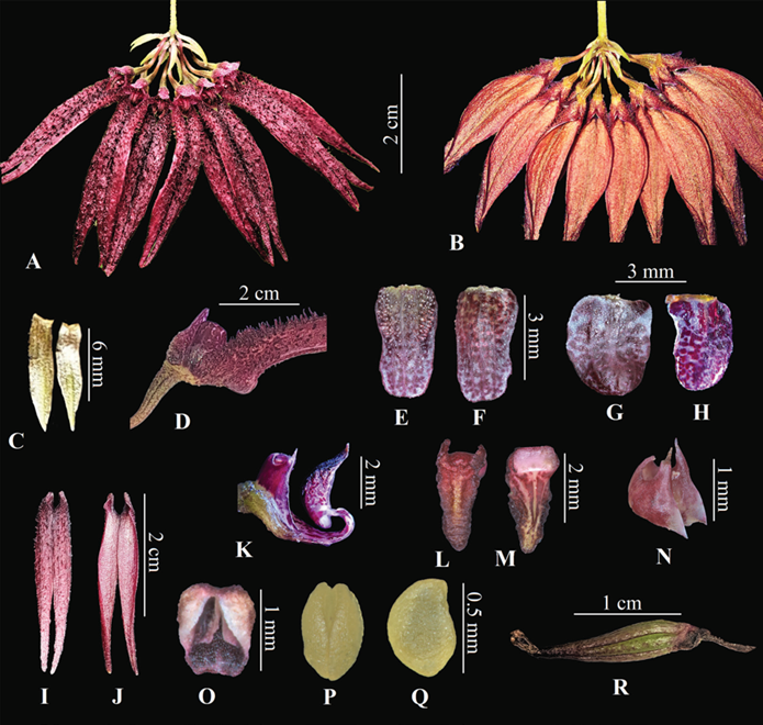 Notes: Bulbophyllum sonii, which is used for comparison with B. gurungianum, belongs to the B. sect. Biseta, as it shows a simple lip without auricles. Interestingly, B. sonii reported from Tibet Autonomous region of China by Lei et al. (2022) deserved to be a distinct species, and it should be B. gurungianum described in this study because inflorescence is raceme, with less dense flowers, 8-12 flowered (vs. more dense, ca.>20 flowers per inflorescence in B. sonii), petals oblong (vs. oblong-ovate), margin ciliate (vs. finely erose-ciliate).