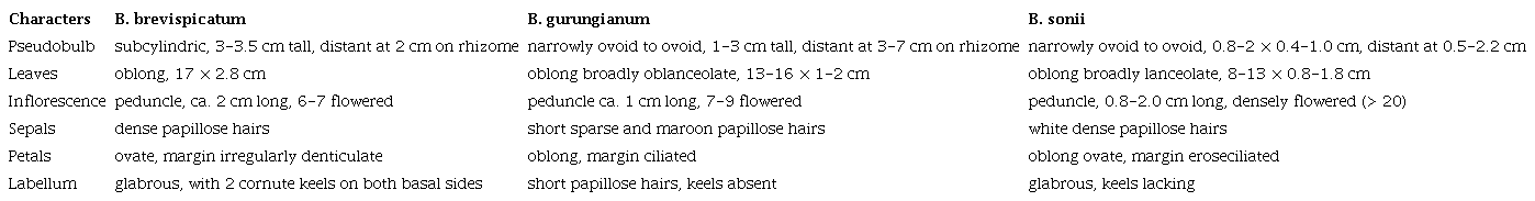 Diagnosis: Bulbophyllum gurungianum shows morphological similarities with B. brevispicatum Z.H.Tsi & S.C.Chen and B. sonii Aver. & Duy in terms of habit and general floral morphology. However, B. gurungianum can be differentiated from B. brevispicatum based on the narrowly ovoid to ovoid pseudobulbs placed distantly (3-7 cm apart), shorter (13-16 × 1-2 cm) oblong to broadly oblong leaves, shorter peduncle (up to 1 cm long), sepals with sparse hairs on the outer surface, oblong petals with ciliate margin and labellum lacking keels in the former versus subcylindric pseudobulbs that are closely (2 cm apart) placed on the rhizome, longer (17 × 2.8 cm) leaves, longer (2 cm long) peduncle, sepals with dense papillose hairs, petals ovate with irregularly denticulate margin and labellum glabrous with 2 keels in latter. On the other hand, B. sonii has dense papillose hairs on the sepals, petals are ovate-oblong with erose to ciliate margin, and labellum glabrous without any keels (Table 1).