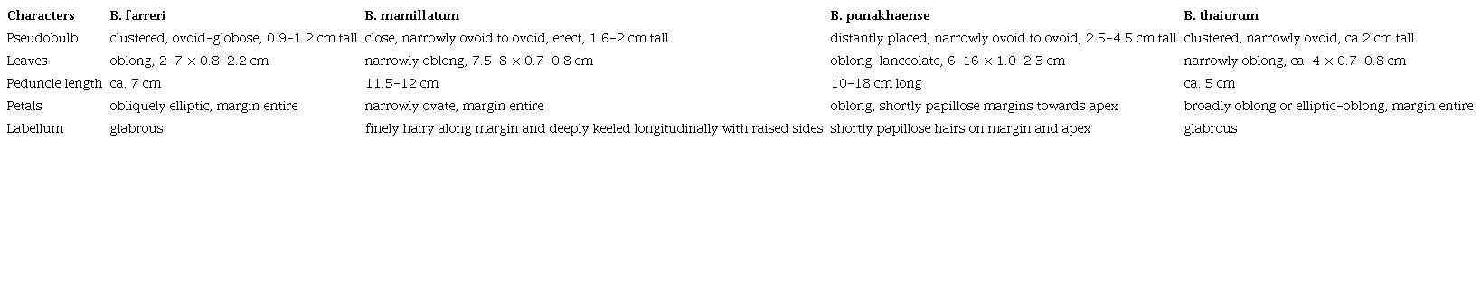 Diagnosis: Bulbophyllum punakhaense shares morphological similarities with B. farreri (W.W.Sm.) Seidenf., B. thaiorum J.J.Sm., and B. mamillatum Vuong, Aver. & V.S.Dang in having coarsely papillose lateral sepals but differs in having laxly placed and longer (2.5-4.5 cm) pseudobulbs, dorsal sepal ovate-oblong, obtuse and densely papillose on the outer surface towards the base and margin shortly papillose towards the apex, lateral sepals together forming ca. elliptic structure (widest point approximately halfway along its length), petals oblong, obtuse and shortly papillose towards the apex, labellum shortly papillose on margin and apex (Table 2).