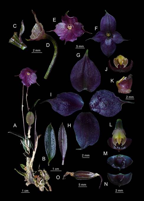 Terrestrial herb up to 30 cm long, erect. Rhizome slender1.8-2.0 mm thick. Ramicauls 0.5-1.5 cm long, spaced 2.0-2.5 cm apart, covered by 2 apiculate, translucent, slightly warty funnel-shaped sheaths, the basal sheath 9.0 × 2.0-2.3 mm, and the apical sheath 13.6 × 1.2 -2.3 mm. Roots slender, fasciculate, 1.2 mm thick, arising from the nodes that give rise to the twigs. Leaves semi-erect, oblong-elliptic, cuneate base, denticulate, apiculate, 2.0-3.5 × 0.5-0.7 cm, somewhat lanuginose towards the underside, 7 veins, with the apiculus 1 mm long; terete petiole 2.0-2.2 mm long. Single-flowered terminal inflorescence, erect, purple, floral peduncle 6.6-9.0 cm × 0.7-0.8 mm, with 2 apiculate tubular bracts, one located in the middle of the peduncle and the other at its base, 9.0 × 1.0-2.2 mm; funnel-shaped floral bract, slightly verrucose, strongly acuminate or apiculate, 4 × 5 mm in the apical part and only up to 1 mm wide in the basal part, apiculus measures 1.3 mm long that surrounds the pedicel, and the 6 mm long, verrucose, green, with purple spots, remains of the axis which fits perfectly on the dorsal part of the lateral sepals of the flower. Robust trapezoid ovary 2.0-3.0 × 1.2-2.0 mm, slightly verrucose. Pedicel short, terete, 1.0-1.2 mm long. Flowers purple, not resupinate, 2.5-2.8 cm in diameter. Sepals purple, conspicuously fleshy; the lateral sepals connate in an ovate synsepal 13 × 9 mm long, apex acuminate in a short 2 mm long tail, separated (bifid) towards the apex by 1 mm, with entire margin, not scallop, 5 veins, lanuginose towards the adaxial surface and minutely papulate towards the abaxial surface with the presence of some scattered whitish hairs; dorsal sepal slightly oblong-ovate, 12 × 8 mm, 3 veins, apex acuminate into a 1.7-1.8 mm short tail, twisted to the left; entire margin not scalloped, lanuginose towards adaxial surface, papular towards abaxial surface, hairy scattered whites. Petals purple, entire edge scalloped, with the base in narrow, elliptic 12 × 6 mm length 3 veins, obtuse apex acuminate into a thin and slightly short 3 mm long tail. Lip purple transversely oblong-elliptic, concave, seen from above; transversely cordate, seen from the front, 5.5-6.0 × 2.8-3.0 mm, the lateral angles acute, curved, the apex broadly rounded, strongly apiculate, acute triangular apicle 0.5-0.6 mm, marginally callous, with the margin flattened, disc with a central, trapezoidal, verrucous callus 1.6-1.7 × 1.2-1.3 mm, with a glenion. Column yellow, short, stout, terete, 2.3-2.4 × 2.0 mm long, with apical anther and stigma, the latter bilobed, each one with an acute tooth. Pyriform yellow anther cap 1.3-1.4 mm long. Pollinia 8, claviform, 4 largest 1.2 mm long, 4 smallest 0.7 mm long, yellow. Capsular fruits with six ribs 1.5-1.8 × 0.7-0.8 cm.