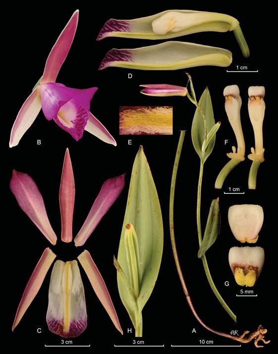 The Epistephium material from Costa Rica agrees well with the protologue and type of E. ellipticum. However, Costa Rican plants have up to five flowers (vs. 12 flowers) per inflorescence, longer sepals and petals (25.0-26.8 × 3.0-5.5 mm vs. ca. 20 × 3-4 mm), white column (vs. pink), and produce fewer fruits (2 vs. 12). Assessing the variation of this broadly distrib uted and rare species is important to characterize it ad equately. Furthermore, careful re-examination of prior works is key to the understanding of this species. We noticed that the scale bar added by Szlachetko et al. (2020) to a reproduction of the type illustration of E. tenuifolium is notoriously inconsistent with the scale bar on the type specimen. Also relevant is the incon sistency between the illustration by Hoehne, which suggests a glabrous lip, and the original illustration ac companying the specimen, which clearly depicts the characteristic villose apical callus.