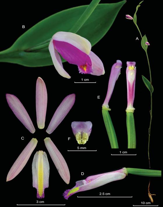 Terrestrial plant up to 50 cm tall. Roots thick, tu berous, 3 mm in diameter, to 3 cm long. Stem erect, cylindrical, hollowed, 3.5-5.5 mm in diameter, brown ish to purplish basally. Leaves ovate-lanceolate, acute, erect, chartaceous, glaucous, with the base clasping the stem, slightly concave, 4.5-9.0 × 2.0-3.6 cm, the apex acute, forming a very small hooded tip, the basal leaf reduced to a small ca. 2 × 1 cm sheath. Inflorescence a raceme with a single flower open at a time, and a few more opening several days afterwards in slow succes sion, subtended by foliaceous, ovate-lanceolate, acute, erect, chartaceous, glaucous bracts, 5.1-10.0 × 1.8-3.5 cm, the apical one smaller, the base with its base clasp ing and decurrent with the stem for 1-2 cm, the apex acute, forming a very small hooded tip; rachis 7.5 cm long and 2.5 mm in diameter; the remnant of the axis in a form a 1 mm long filament at the base of the apical ovary, opposite to the bract. Ovary pedicellate, 2 cm long, 3 mm wide, cylindrical, terete. Flowers resupi nate, with sepals spreading, petals and lip flanking the porrect lip and column. Dorsal sepal free, 6.3 × 1.1 cm, ensiform, acute, with incurved margins, pinkish with light green at the base, 12-veined. Lateral sepals free, 6.0 × 1.1 cm, ensiform, acute, with incurved mar gins, pinkish on the adaxial surface and lighter on one side, light green abaxially and slightly pinkish laterally at the base. Petals free, 6.0 × 1.5, oblanceolate, apex acute, recurved, slightly asymmetrical, wavy, light pink basally and magenta to the apex, 12-veined. Lip oblong, 5.5 × 2.5 cm, obtuse, blade white with pinkish to purplish stripes at the apex, 13-veined, yellow along the center of the crest, lateral margins forming a tube around the column, blade longitudinally 2-crested, the first basal third of the crests with a common thickened 1.5 mm high base, the crests at the base of the blade 7 mm wide when spread, with recurved margins, the crests above the 2/3 of the blade 4 mm wide, forming multiple lamellae that progressively becomes irregu lar and warty towards near the apex. Column clavate, whitish, 3.4 cm long, 3 mm wide basally, 7 mm wide apically, the base with a pair of pear-shaped glands, clinandrium lacerate with the dorsal and lateral margin longer, the lateral ones forming acute teeth. Anther ob trapezoid, 9 × 8 mm, whitish, with a 5 mm wide loose mass of pollen which does not form a pollinia. Fruit cylindrical, glaucous, 4.5 cm long, 7 mm thick, with falling perianth. This description is based on the cited Costa Rican materials only.