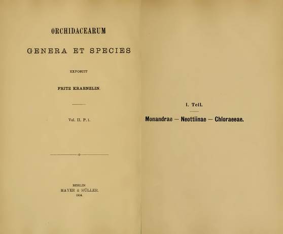 As the result of the investigations on said material and a precedent work prepared by him during the years 1901 and 1902 based on specimens from Argentina and Uruguay, Kraenzlin published in Berlin in 1904Orchidacearum genera et species. Vol. II p. I: Monandrae, Neottiinae, Chloraeeae” (Reiche 1910).