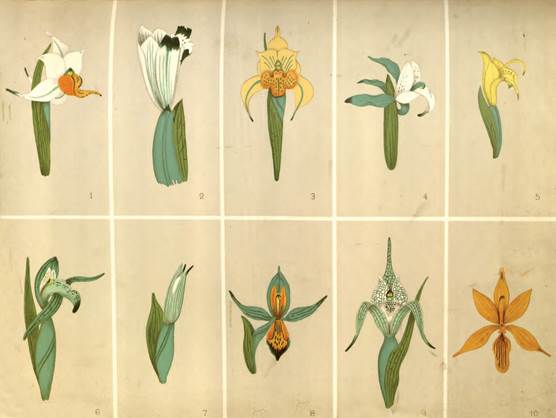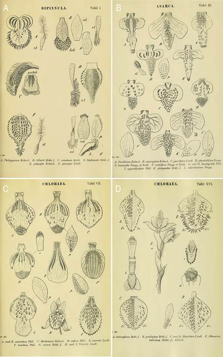 Although Reiche’s importance in the history of Chilean botany can never be denied, he was not a particularly gifted illustrator. Orchidaceae Chilenses shows several anatomic details of orchids, concentrating on lineal drawings of petals, sepals, and labella, and two plates at the end of the book with coloured illustrations of a total of 18 orchid flowers. The reprint in 2007 of Reiche’s shows slightly improved lineal drawings (Fig. 20-21). The color illustrations illustrate the following orchid species: Asarca sinuata Lindl., Chloraea ulanthoides Lindl., Asarca odoratissima Poepp. & Endl., Chloraea galeata Lindl., Chloraea multiflora Lindl., Chloraea cylindrostachya Poepp., Chloraea fonckii Phil., Chloraea disoides Lindl., Chloraea grandiflora Poepp., and Chloraea nudilabia Poepp. in Plate I (Fig. 20); and Chloraea crispa Lindl., Chloraea cristata Lindl., Chloraea cygnaea Phil., Chloraea chrysantha Poepp., Spiranthes diuretica (Willd.) Lindl., Habenaria paucifolia Lindl., Bipinnula plumosa Lindl., and Pogonia lessonii Rchb.f. in Plate II (Fig. 21).